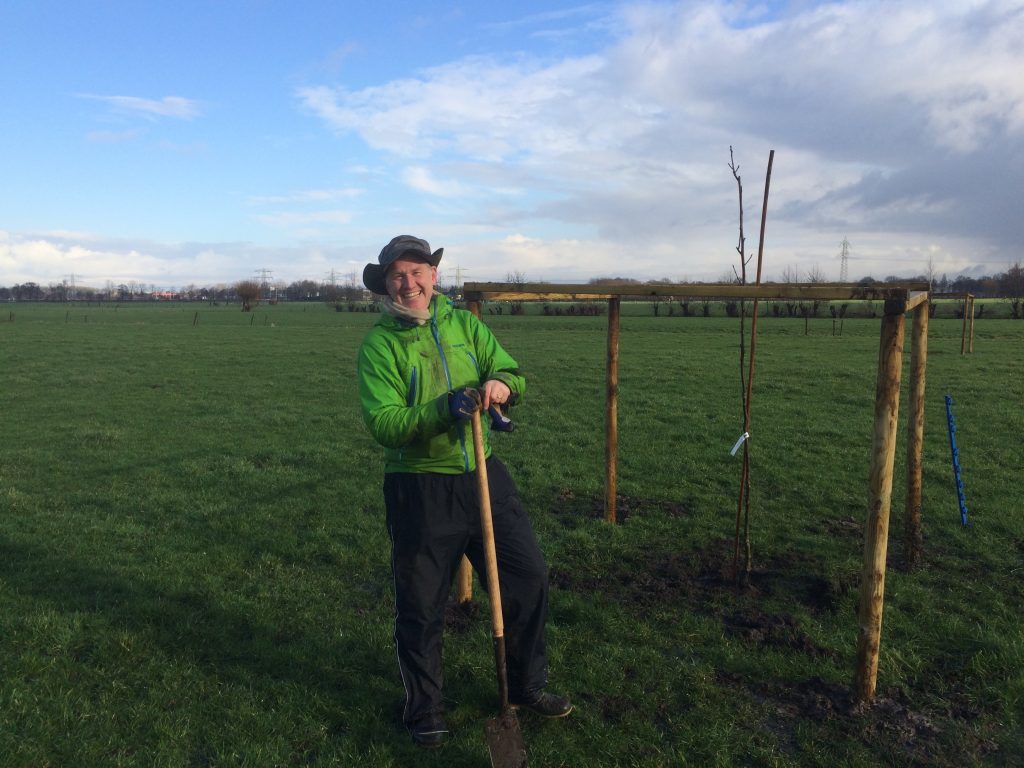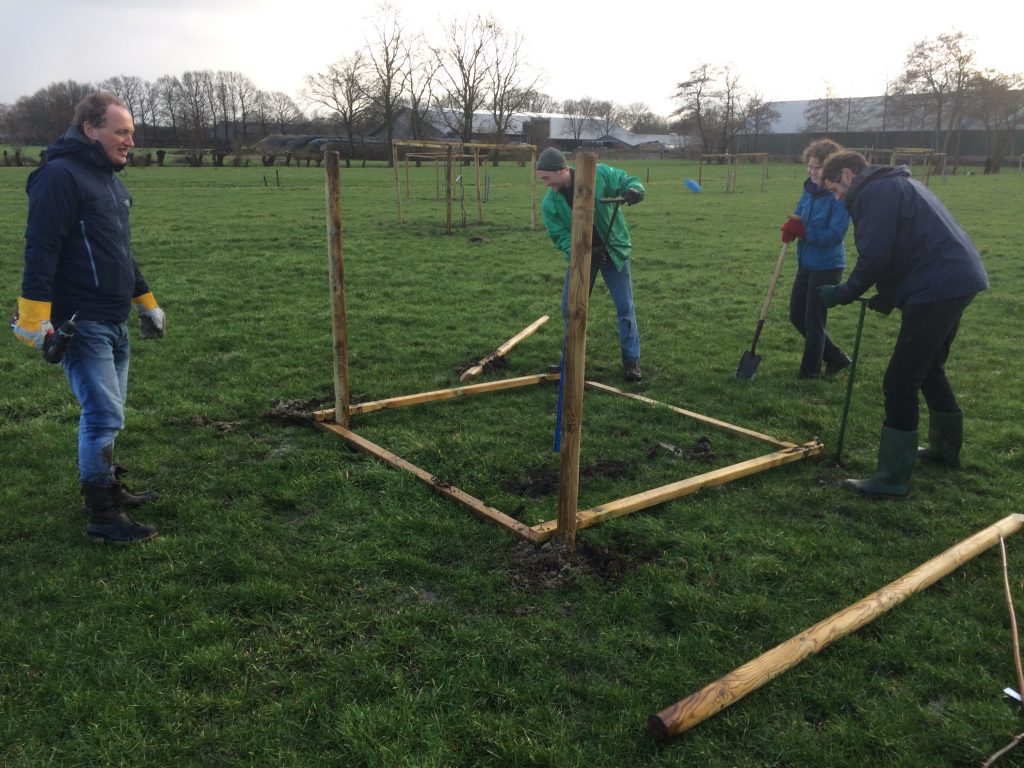 De bomen zijn omheind, en er komt schrikdraad op 1 meter hoogte, zodat de koeien hier tussen kunnen lopen zonder de bomen te beschadigen.